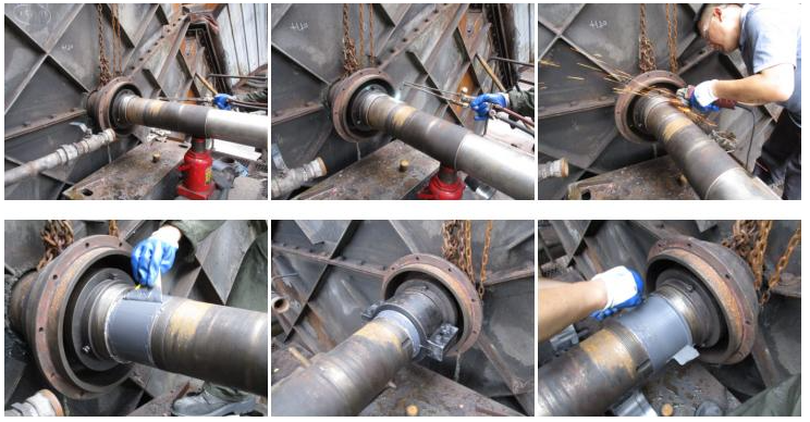 5.移除迷宫密封或甩油环,松开锁紧环和止退片,架式工具上的拆卸轴承。注:工装应套在轴承内圈上,不能在外圈上受力,架好后受力正中,不能倾斜;压压时,人应站在轴承的侧面,防止丝杆断伤击打人;若拆下,可用热油沸浇。